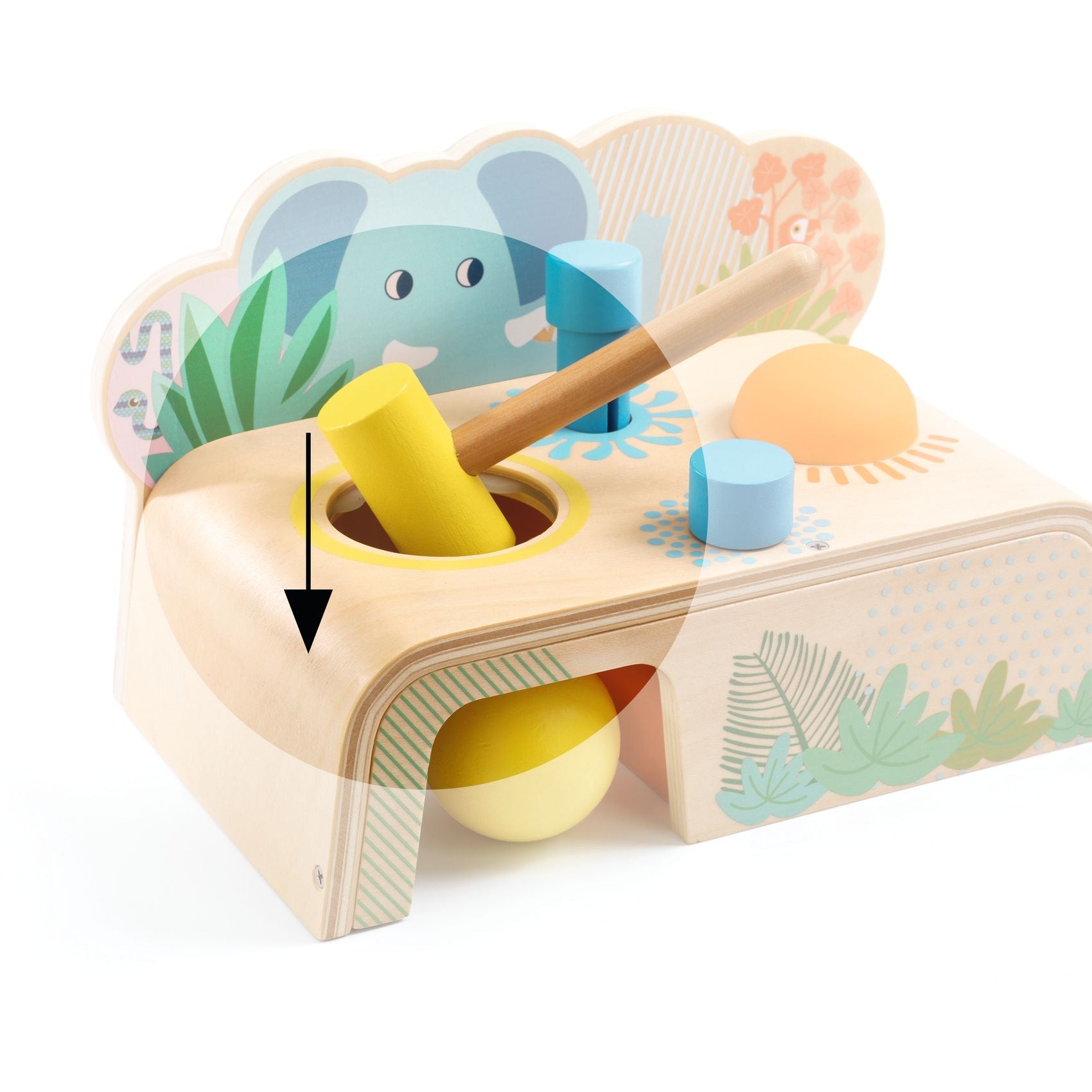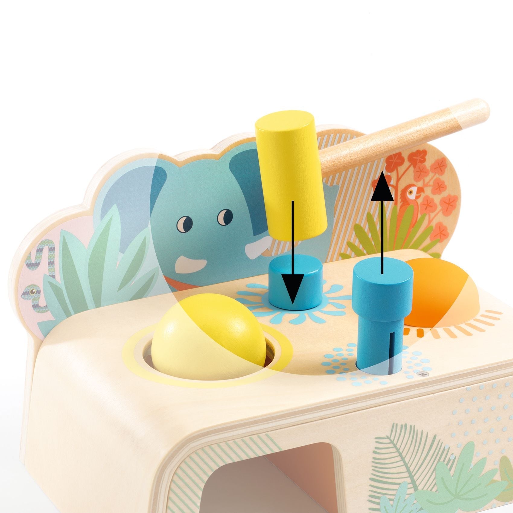 משחק עץ בו הילד מגלה שלוש אפשרויות איך להכות עם הפטיש.מכים על הכדור והוא מתגלגל דרך הדלת, מכים על הצילינדר הכחול והשני מופיע,מכים על הכפתור הכתום וצליל של צפרדע נשמע.כיף וקל.