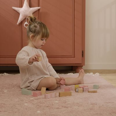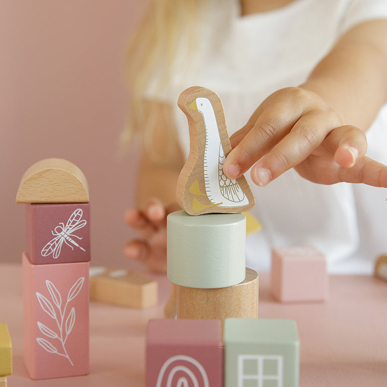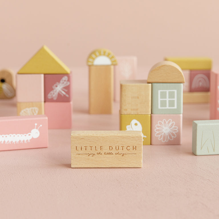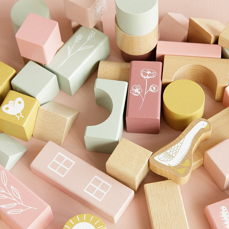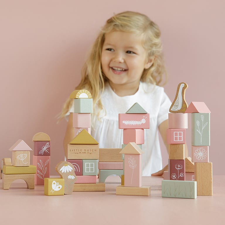 The bucket contains 50 wooden blocks in in various shapes and sizes, decorated with prints from Flowers and Butterflies collection. Stack the blocks to build fun shapes or towers. The blocks guarantee a lot of building fun and can be stored effortlessly in the bucket