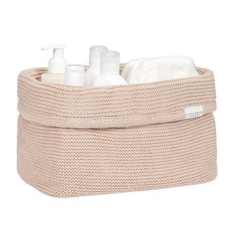 Basket keeps the changing table nice, tidy and organised. The basket is made of a knitted fabric in 100% organic cotton and oekotex certified. The basket is reinforced, so it will also hold up well without or with few items in it. The basket has a wrap-around edge, allowing you to use it 2 heights. The inside also has the knitted fabric, giving it a luxurious look