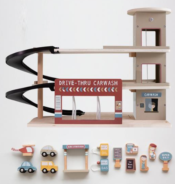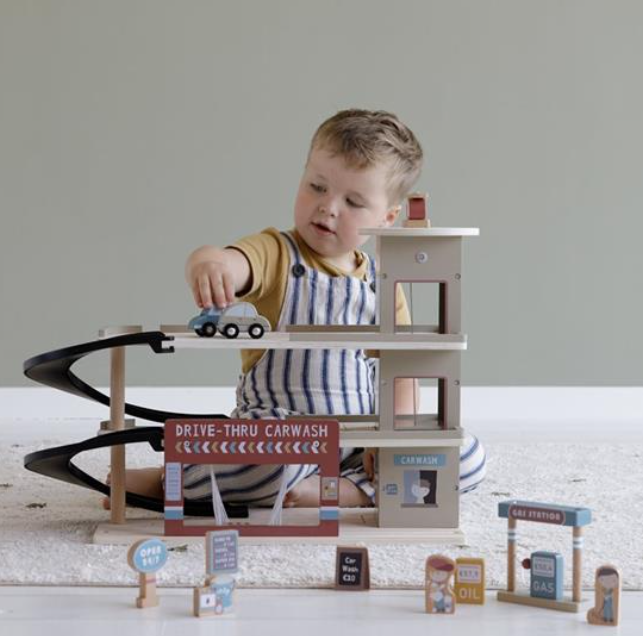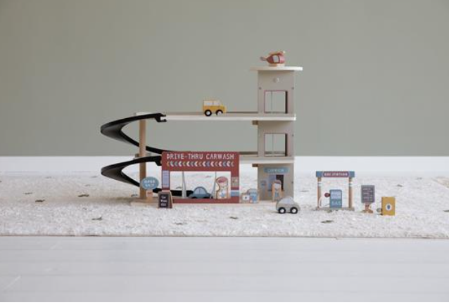 Stop at the garage to fill up with petrol, park your car or get it cleaned at the carwash. The extension includes a garage with carwash, cars, helicopter, petrol station, pumps, signs and employees. The wooden garage is one of many play sets that can be linked to the Little Dutch XXL train set. On the garage you will find a helicopter platform and the wooden figures have a detailed illustration on both sides. You complete the garage with the train set XXL and the extension sets for hours of fun. No track pieces are included with this set.