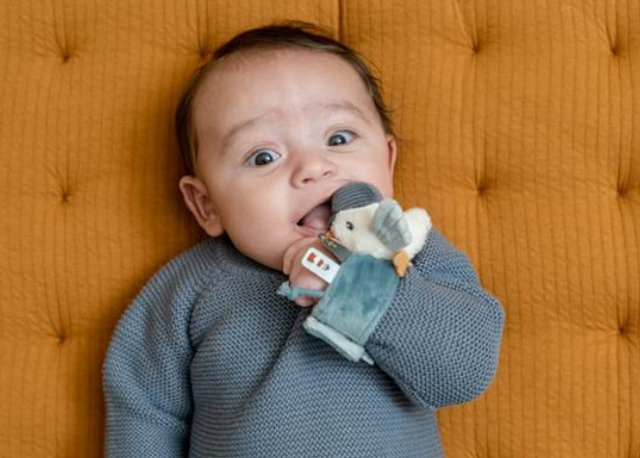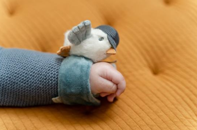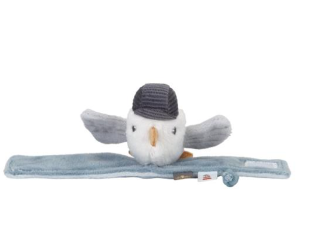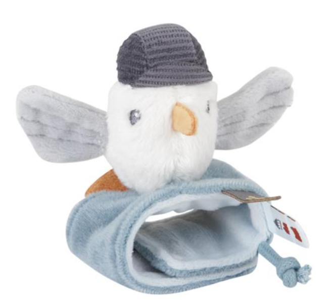 Flap your hands and be amazed! This soft rattle bracelet will get your baby excited. Just strap it around your little one’s wrist and let the rattling fun begin. The cuddly seagull on top of the bracelet is ready to move! But there is more to explore. Crinkly parts, labels and a little knot encourage grasping and touching. A wonderful toy for a happy baby.