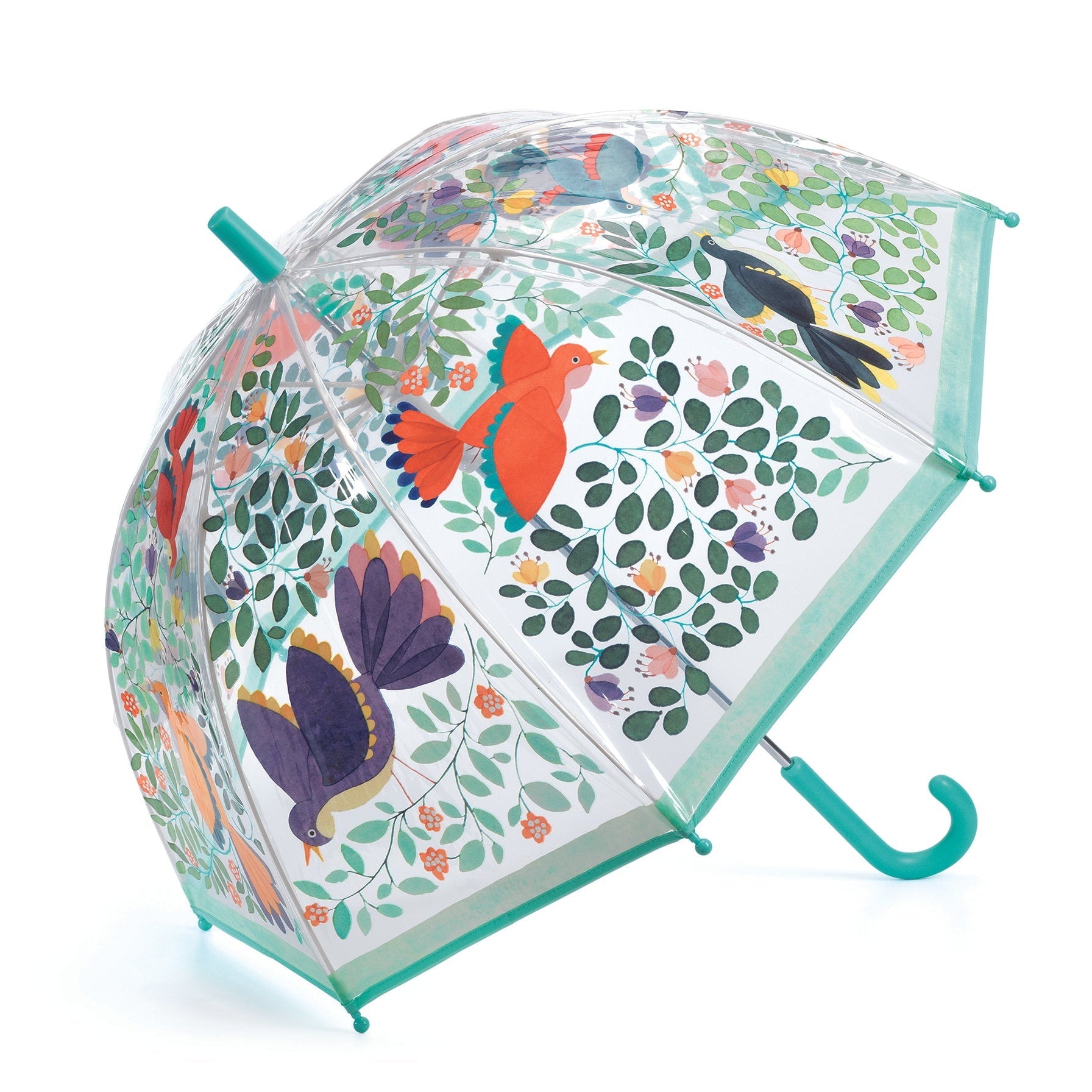 Umbrella with semi-transparent plastic and full rain protection. Manual opening mechanism with safety features so the child's fingers won't get caught.