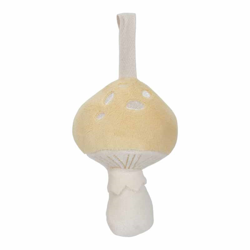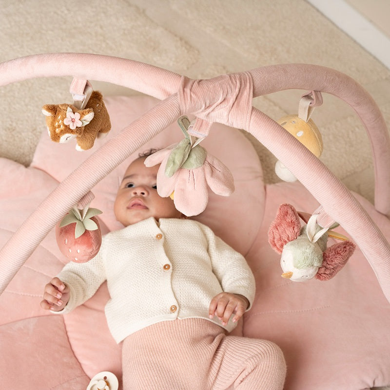 This flower-shaped activity mat in a soft pink tone has two large arches with 5 different cuddly toys. So much to see, feel, and hear. The deer, bird, flower, mushroom, and strawberry will help little ones develop sensory skills and stimulate hand-eye coordination