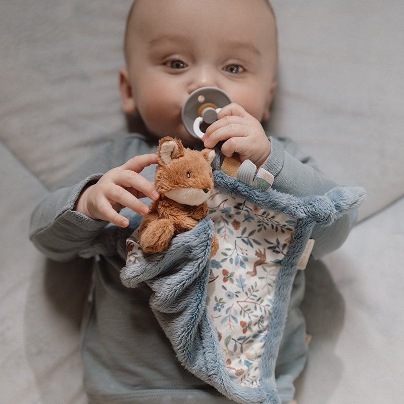 Keep this soft cuddle cloth within reach for comforting cuddles anytime. Printed in the Forest Friends design, it features various labels that stimulate the senses, easy-to-grab knots, and a loop to attach a pacifier or teething ring. The soft little fox makes the cloth extra cuddly