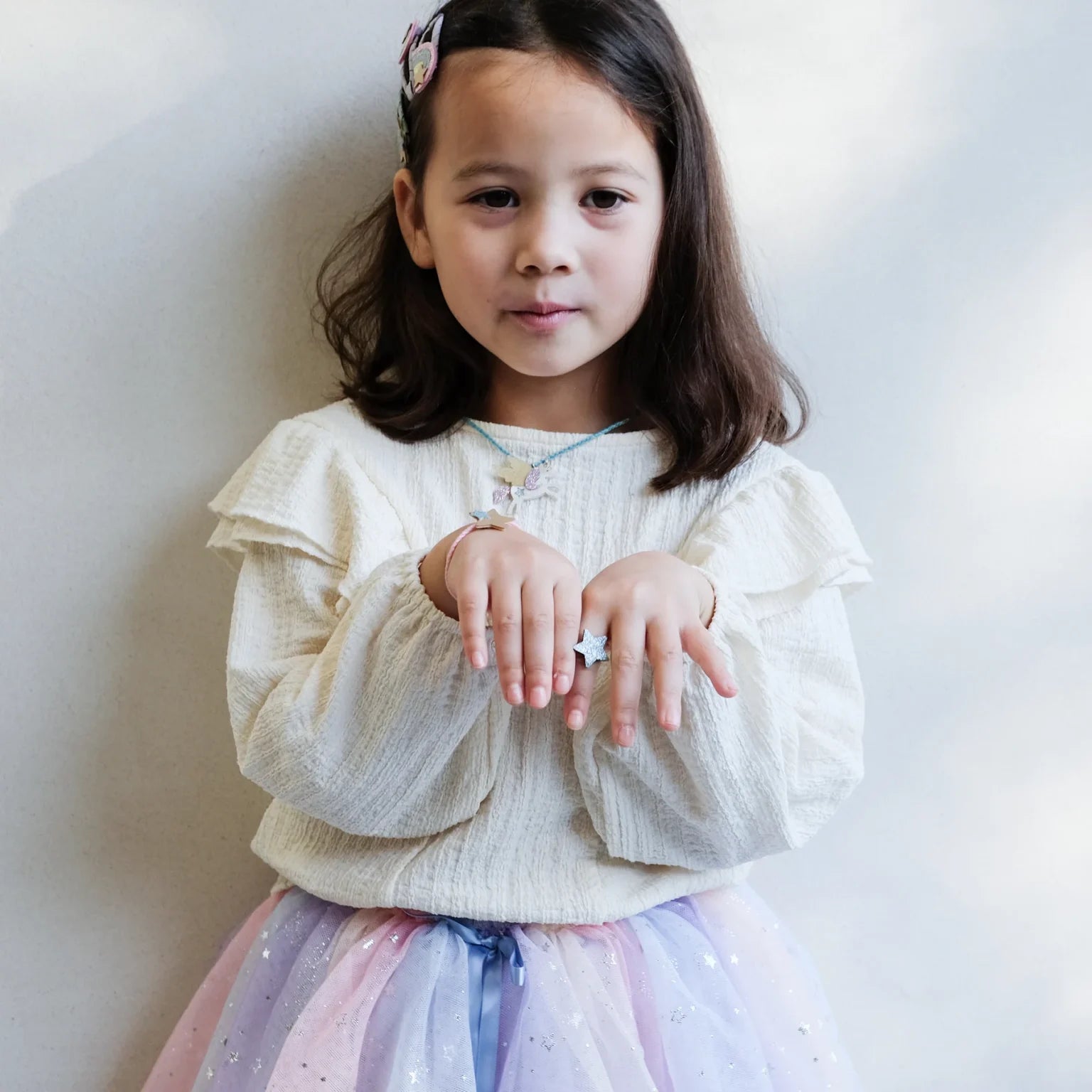 Set includes one necklace, bracelet and a ring featuring a beautiful unicorn and sparkling stars crafted from soft leatherette and glitter fabrics