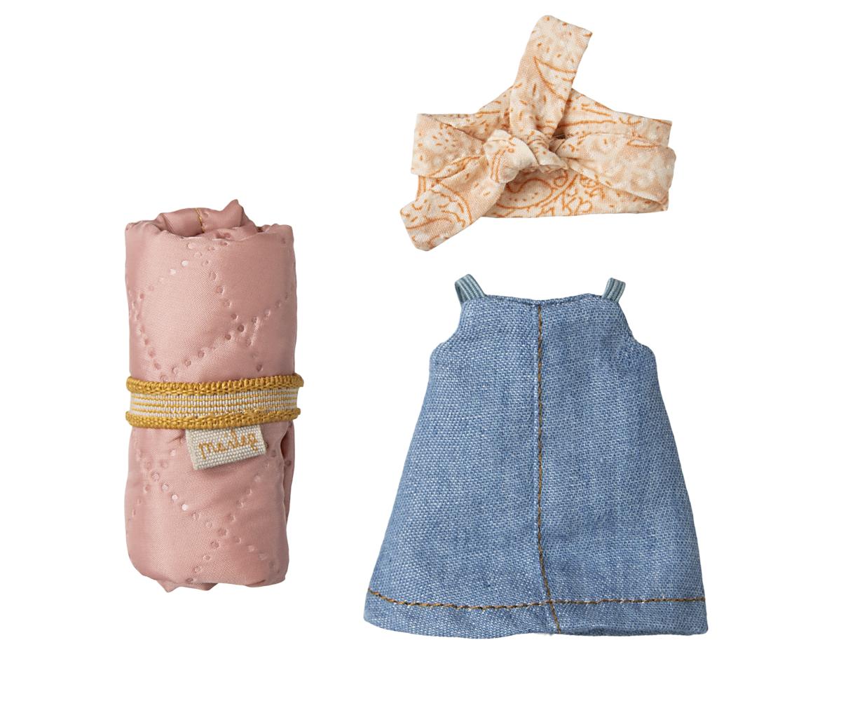 This mouse is well-prepared for a hiking trip in the wild nature. She is dressed for days of walking and brings her sleeping bag for nights under the stars. She has magnets in her hands. Add more accessories from the hiker collection for more play.