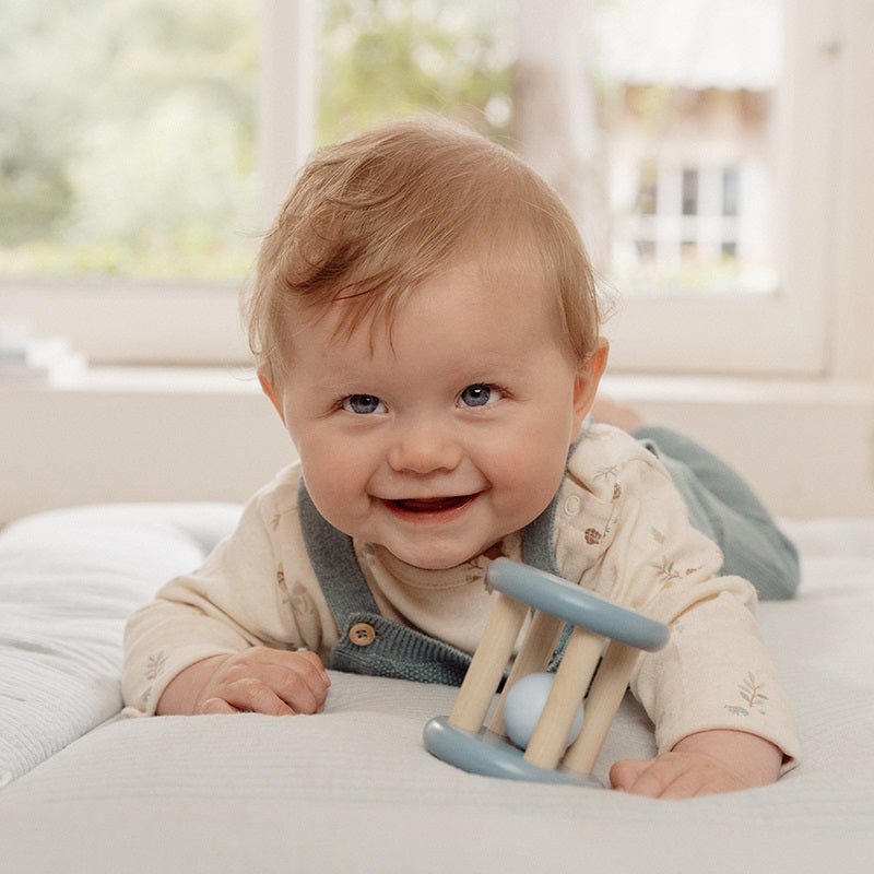 This wooden rattle rolls and rolls, making a rattling sound as it goes. The toy promotes hand-eye coordination and is specially designed to be grasped by little children's hands