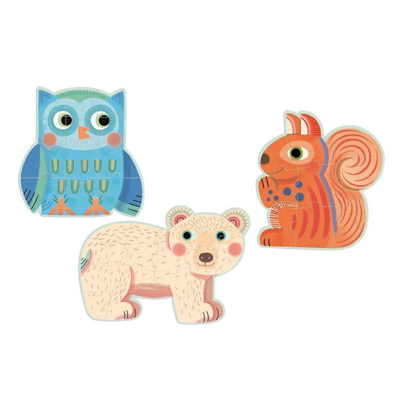 3 פאזלים בשלושה גדלים, פאזל שלבים זה עוזר לילדים להיכנס לעולם הרכבות הפאזלים כך שמתחילים בפאזל הקטן יותר בעל 9 החלקים ומגיעים בסוף להרכבת פאזל של 16 חלקים.פאזל שלבים זה מגיע לאחר פאזל השלבים הראשון ובו פאזלים בגדלים של 4,6, ו-9 חלקים.פאזלים אלה כמו שאר הפאזלים של חברת Djeco הצרפתית עשויים מקרטון עבה, קשיח ועמיד מהרמה הגבוהה בעולם.