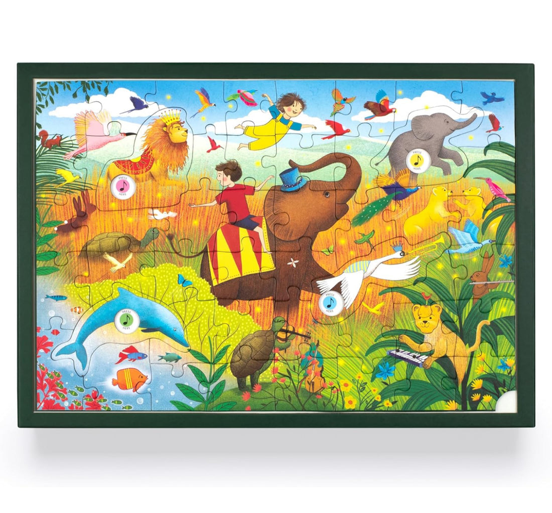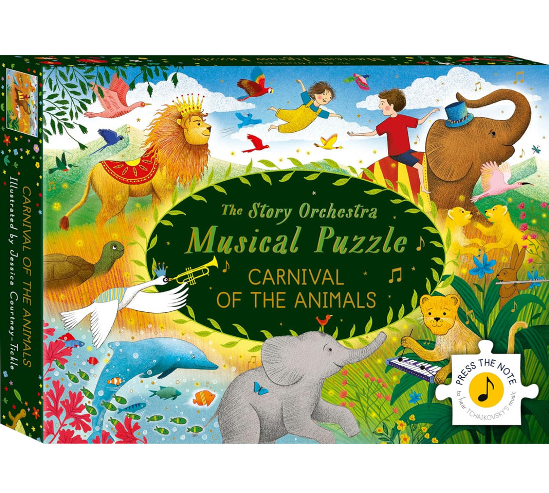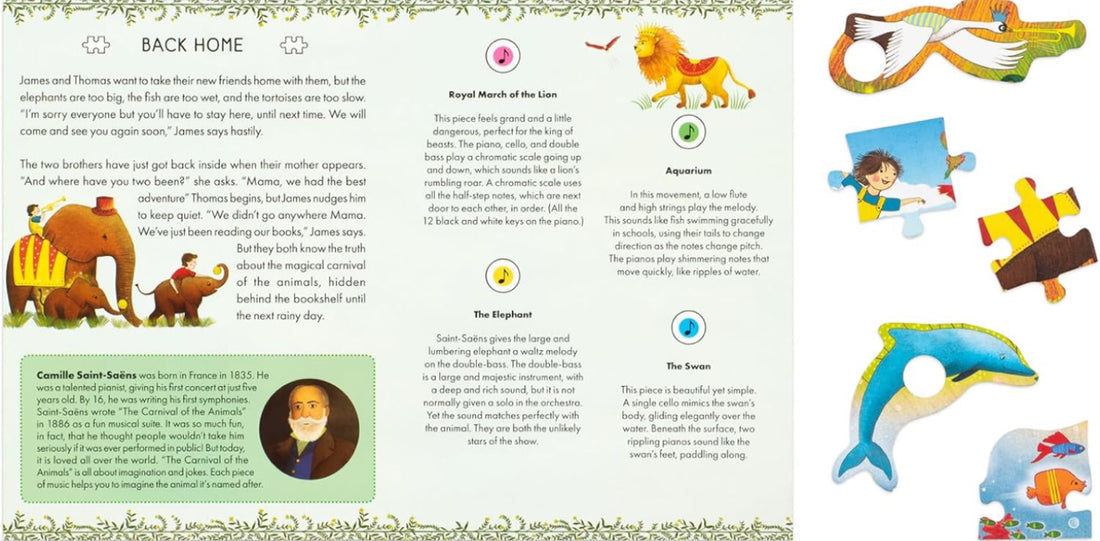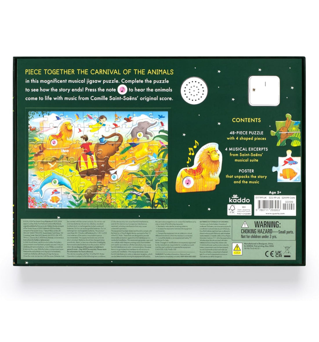 פאזל מוזיקלי של קרנבל החיות: כולל ארבעה קטעי קול של תזמורת מנגנת מתוך הפרטיטורה המקורית של קמיל סן-סנס, מתנה מושלמת לחובבי מוזיקה ואוהבי חיות 4 כפתורים מוזיקליים ללחיצה: השלם את הפאזל כדי לראות איך הסיפור מסתיים ולחץ על התווים המוזיקליים בתוך החלקים המעוצבים כדי לשמוע את המוזיקה קופסת מתנה חזקה מכילה: פאזל 48 חלקים (44 חלקים ידידותיים לילדים, בתוספת 4 חלקים מעוצבים עם גזרות ללחיצה על הכפתורים המוזיקליים) וכרזה חינוכית; גודל הפאזל שהושלם הוא 11.7 × 8.3 אינץ'. חינוך לגילאי 4-7: כולל מסגרת פאזל שנותנת שחזור תמציתי של סיפור הקרנבל של החיות וכרזה דו צדדית עם מידע על המלחין, המוזיקה וסיום הסיפור בצד אחד, והפאזל המלא תמונה בצד השני חבר את ההרפתקה הקסומה של קרנבל החיות של קמיל סן-סנס עם פאזל מוזיקלי ייחודי זה.