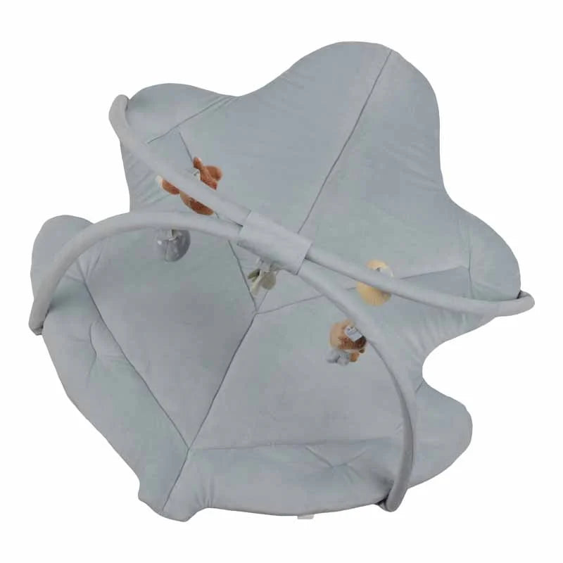 שטיח פעילות בצורת עלה בגוון כחול רך זה כולל שני קשתות גדולות עם 5 צעצועים רכים שונים. כל כך הרבה לראות, להרגיש ולשמוע. השועל, הינשוף החכם, הפטריות הצהובה והכחולה והעלה יעזרו לקטנים לפתח מיומנויות חושיות ולעורר את תיאום העין-יד.