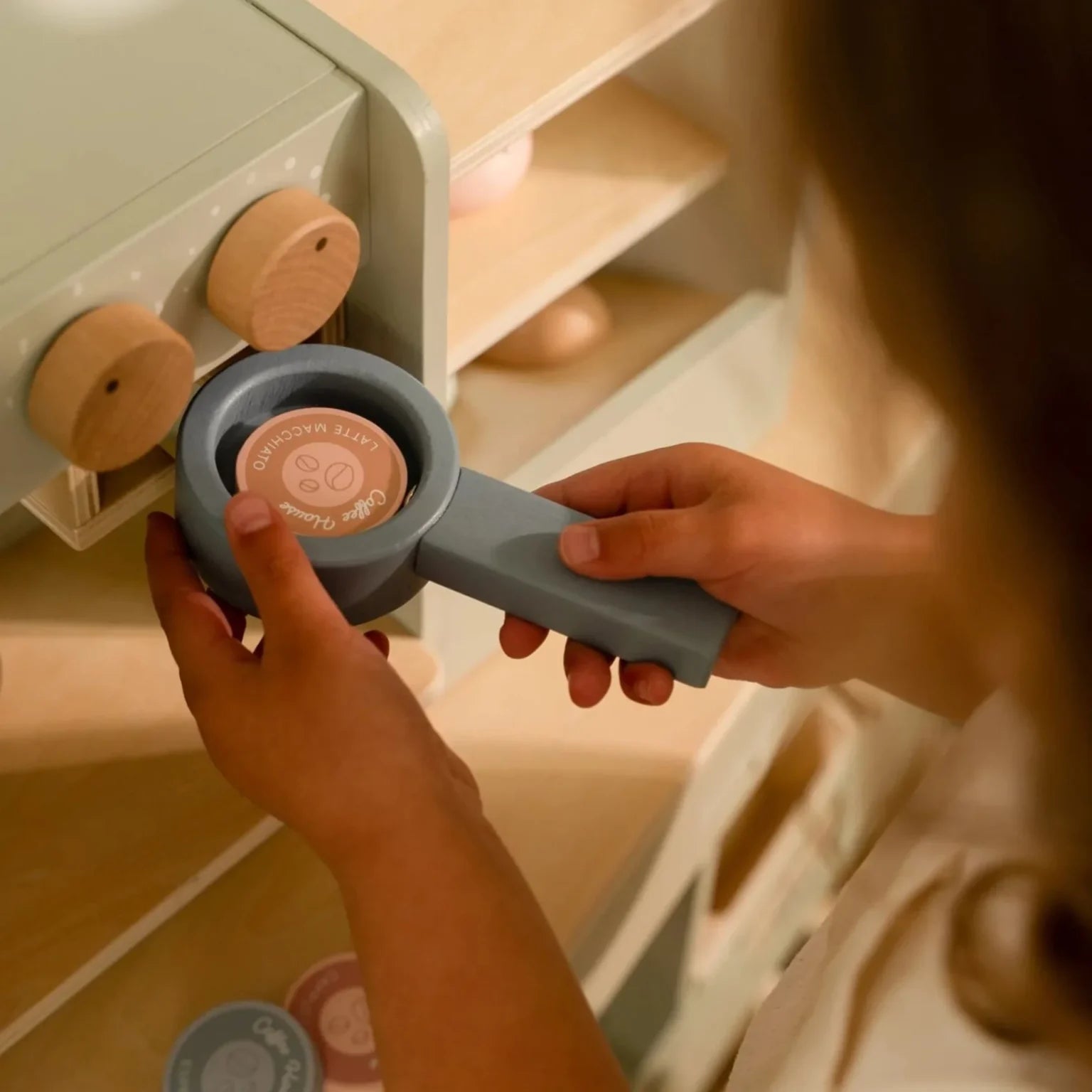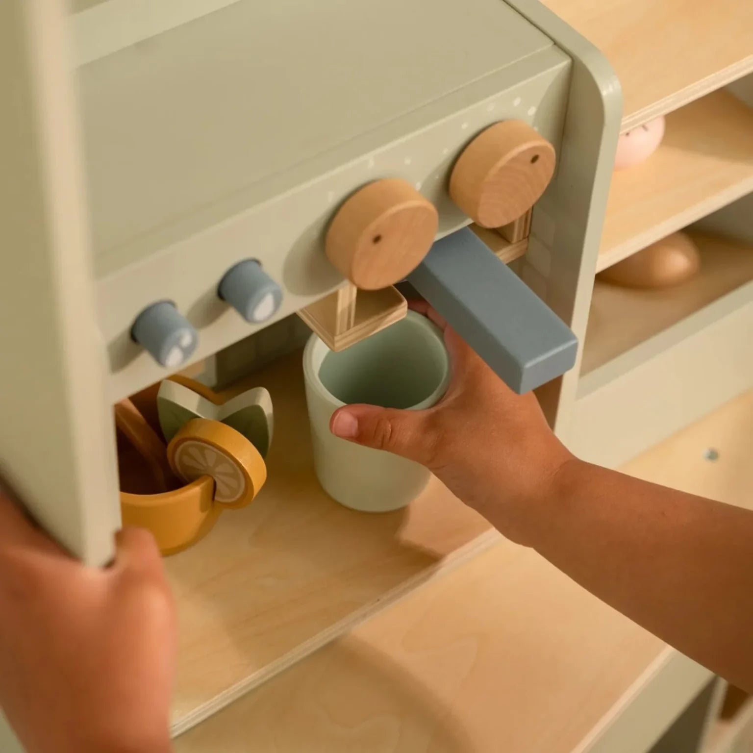 This coffee corner set includes a coffee & tea machine, menu board, serving counter and realistic accessories like cups, pods, tea bags, donut, croissant and more. Perfect for pretend play, role-playing and developing social skills