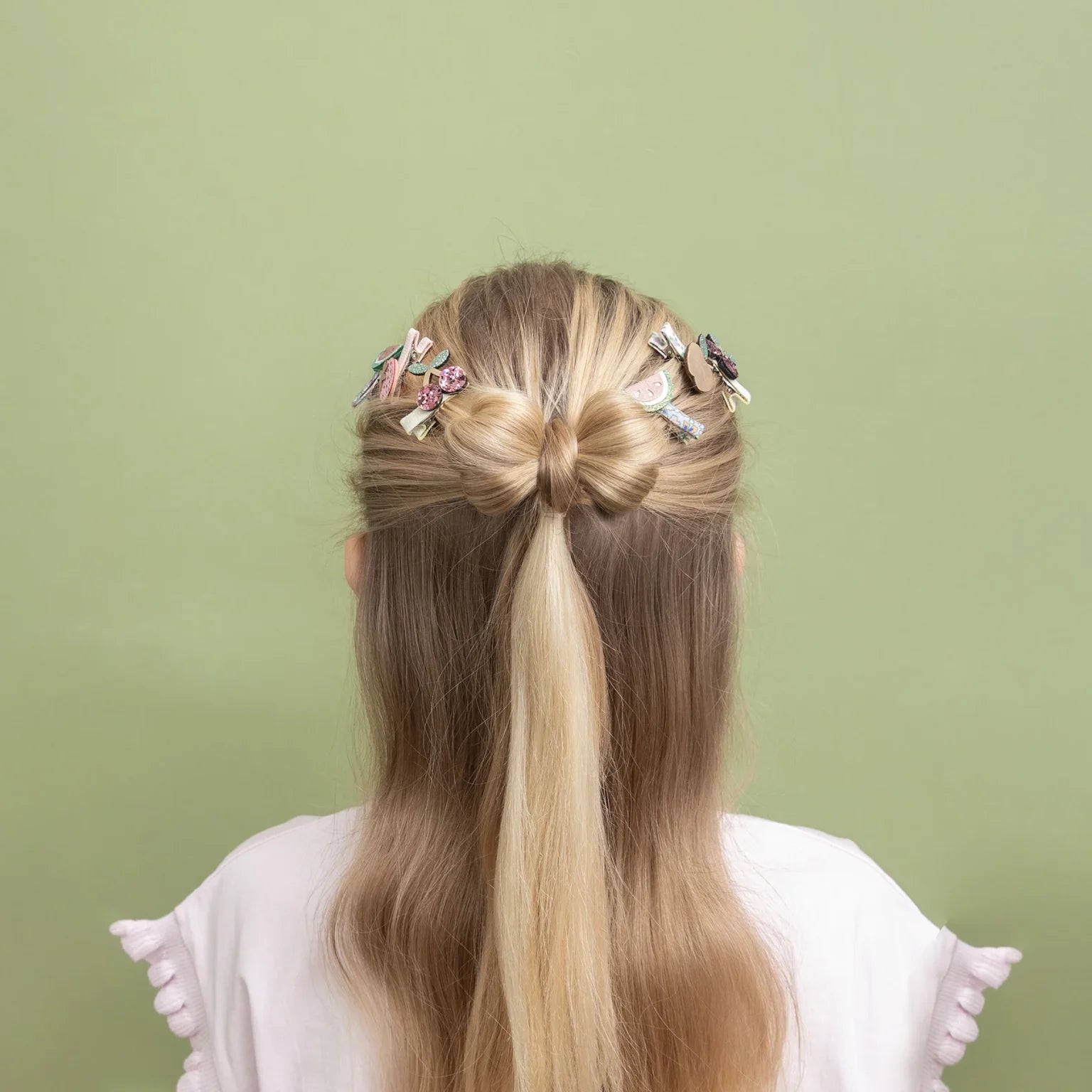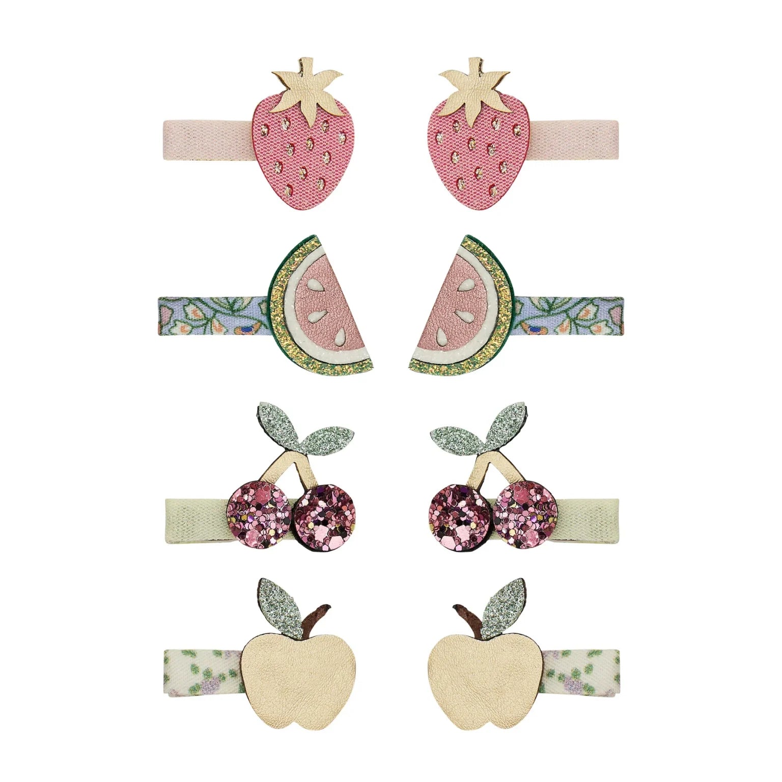 סיכות שיער עם פירות קיציים. עשויות מתערובת של נצנצים ובדים מתכתיים