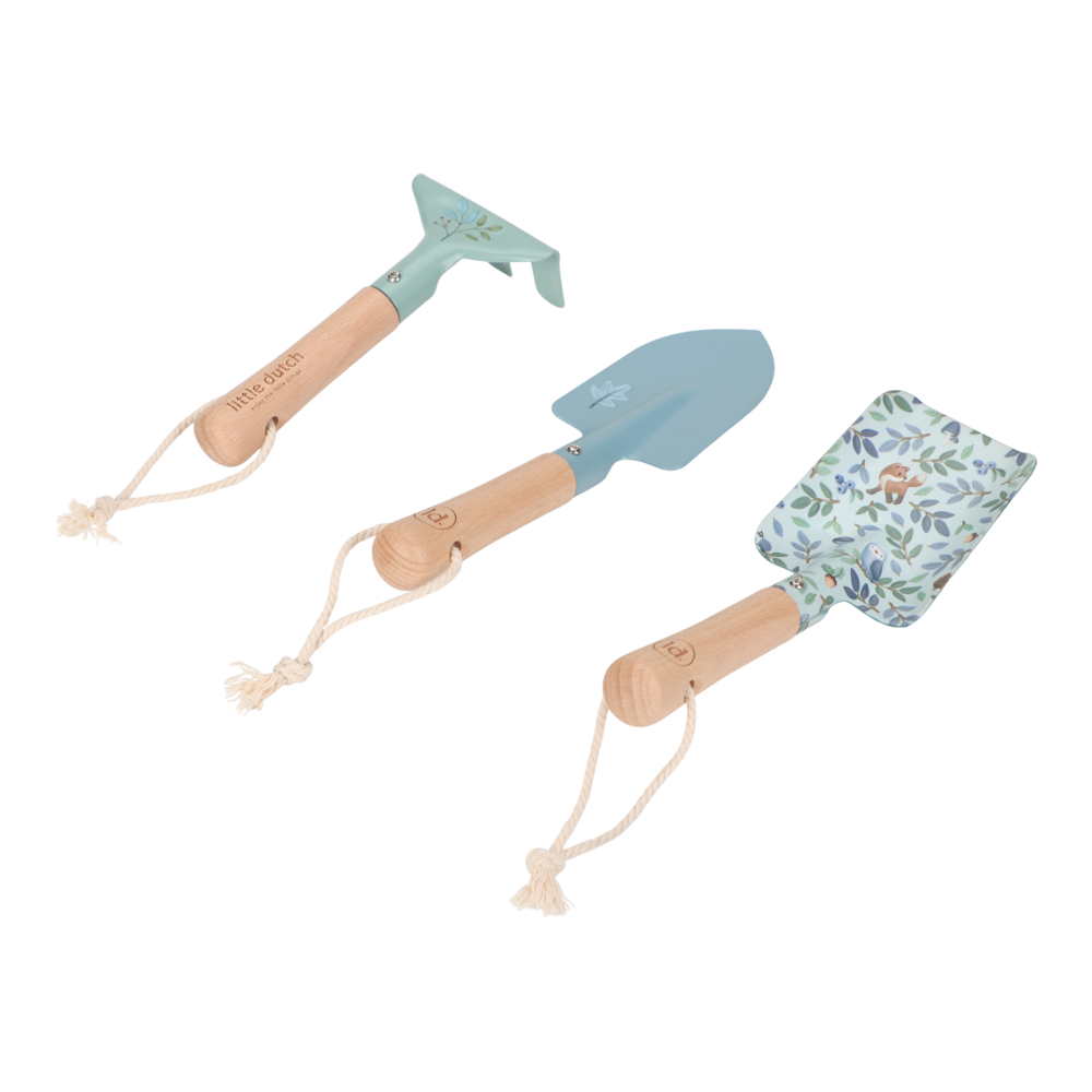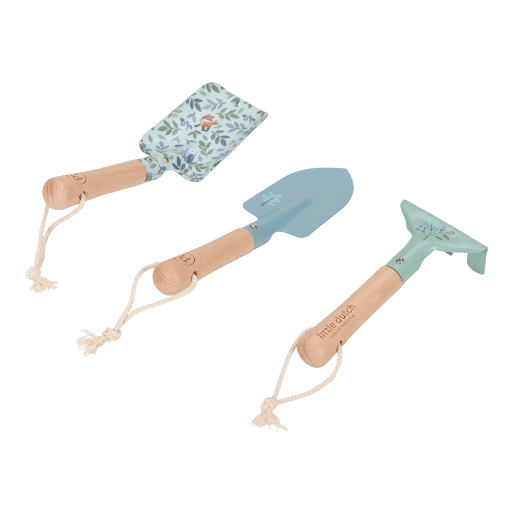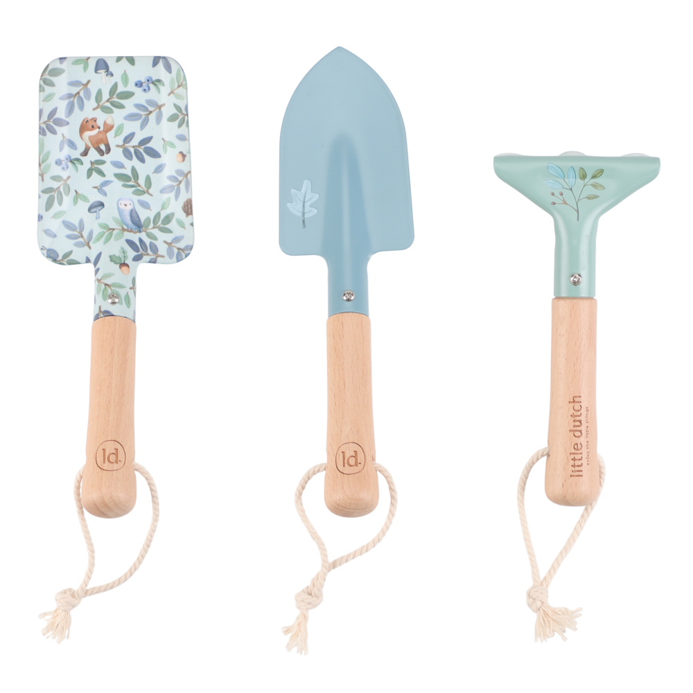 הסט כולל שתי כפות ומגרפה, כולם עשויים מתכת חזקה עם ידיות מעץ לאחיזה נוחה. עם החבלים הנוחים ניתן לתלות בקלות את הכלים לאחר הגינון. מושלם לידיים קטנות.