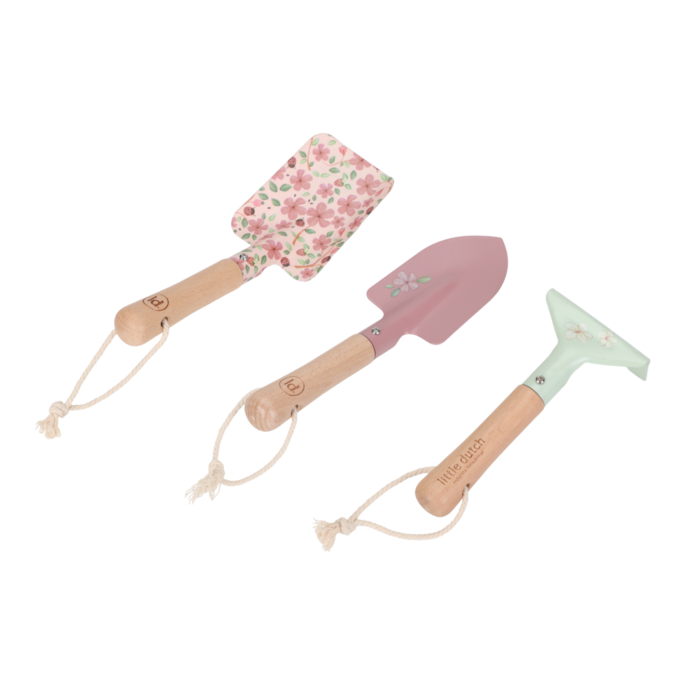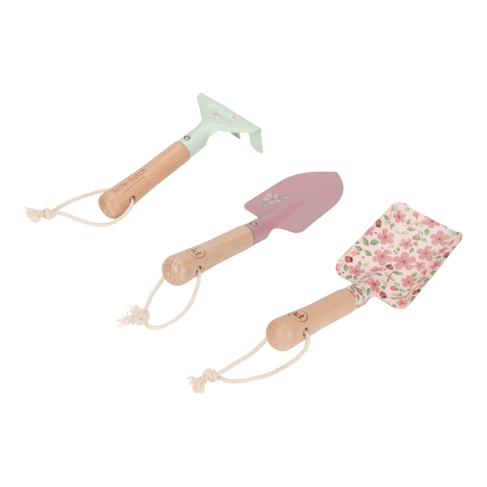 הסט כולל שתי כפות ומגרפה, כולם עשויים מתכת חזקה עם ידיות מעץ לאחיזה נוחה. עם החבלים הנוחים ניתן לתלות בקלות את הכלים לאחר הגינון. מושלם לידיים קטנות.