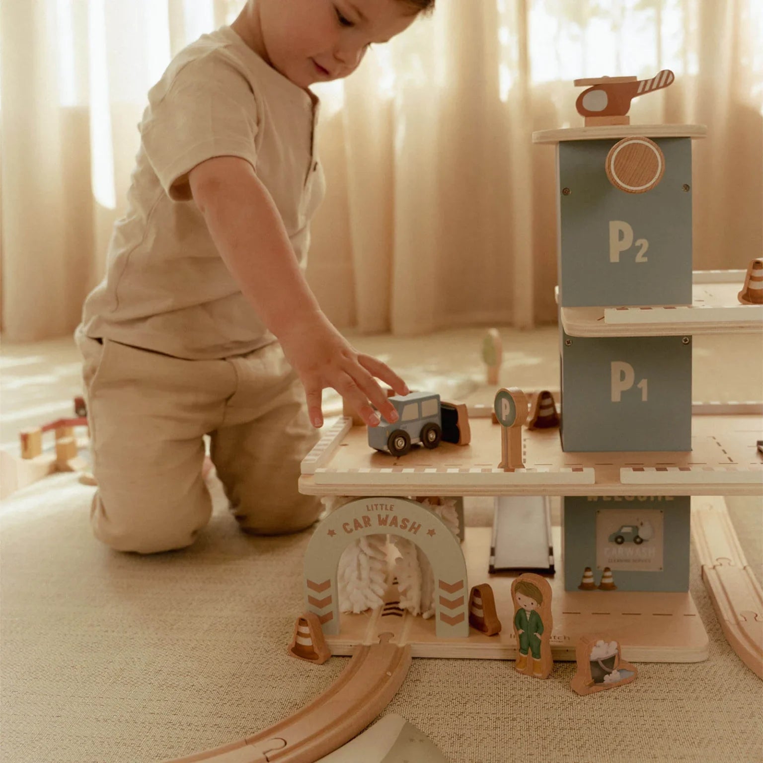 The garage features a ground floor with a car wash, two parking decks, an electric charging station and on top, a helicopter platform. Includes wooden accessories such as traffic signs, stackable tires and a bucket, three vehicles and a helicopter. Drive up, park your car or fly with the helicopter to your destination. Endless playtime guaranteed