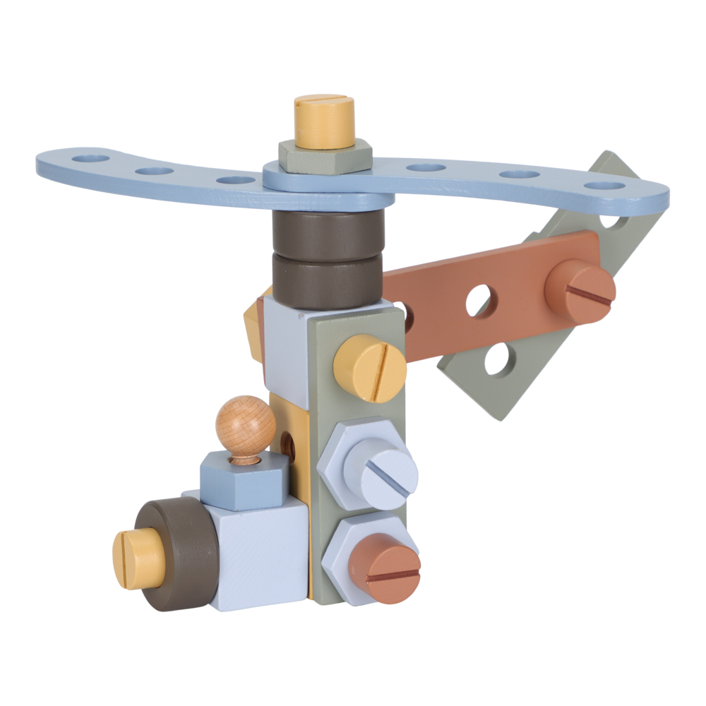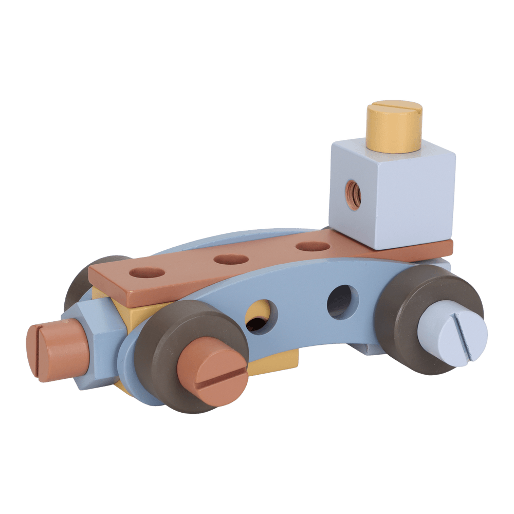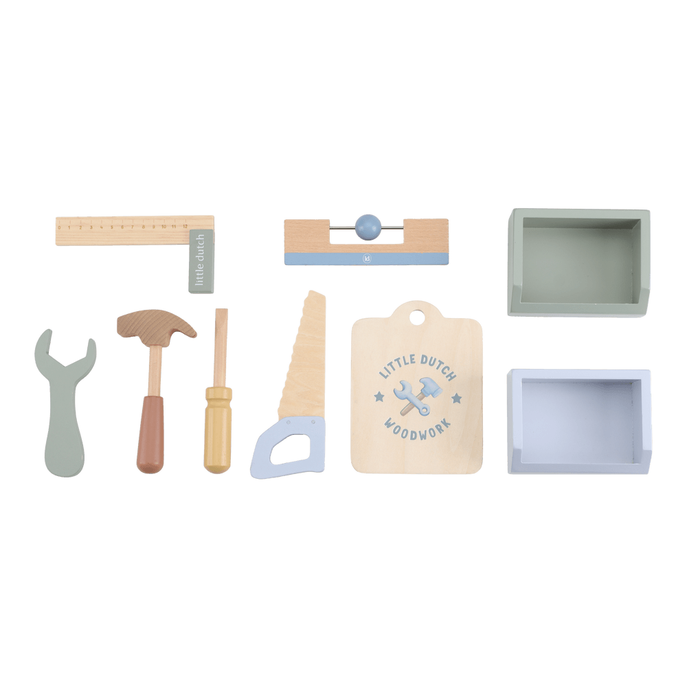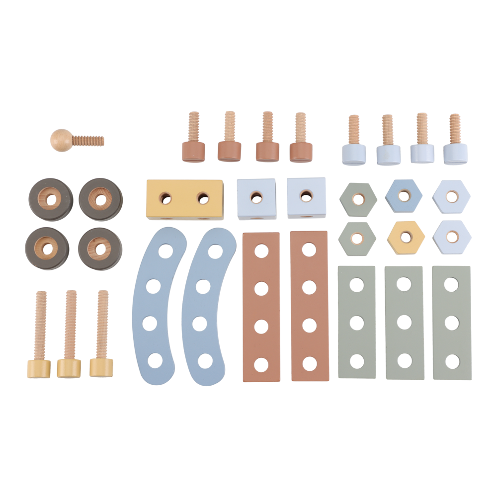 With this sturdy wooden workbench, little ones can hammer, screw and build whatever they want. Whether it's a cool car or their own creative construction – anything is possible! The set includes various tools. Eencourages role play, motor skills and imagination.